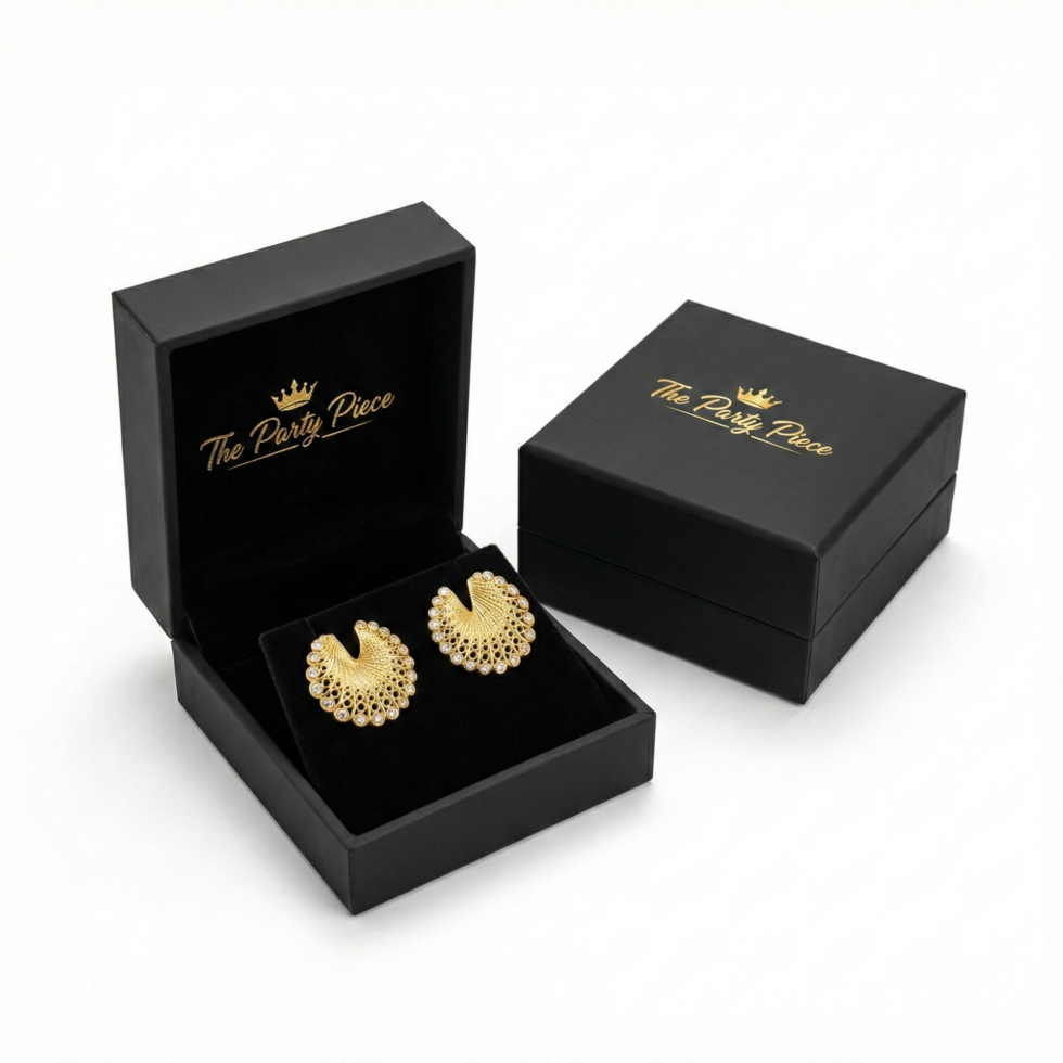 These earrings are crafted with precision to give you the luxurious appearance of real gold jewellery at a fraction of the cost. The fan-inspired design symbolizes grace and elegance, making these earrings a perfect accessory for women who love timeless and statement jewellery.
